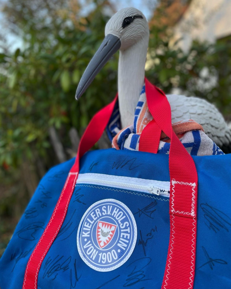 Diese neue Trainingstasche vom Holstein Kiel mit den Unterschriften sämtlicher Spieler können Sie erstehen. Das Mindestgebot liegt bei 50€. Sie selber geben Ihr Gebot ab. Die oder der Meistbietende erhält den Zuschlag.